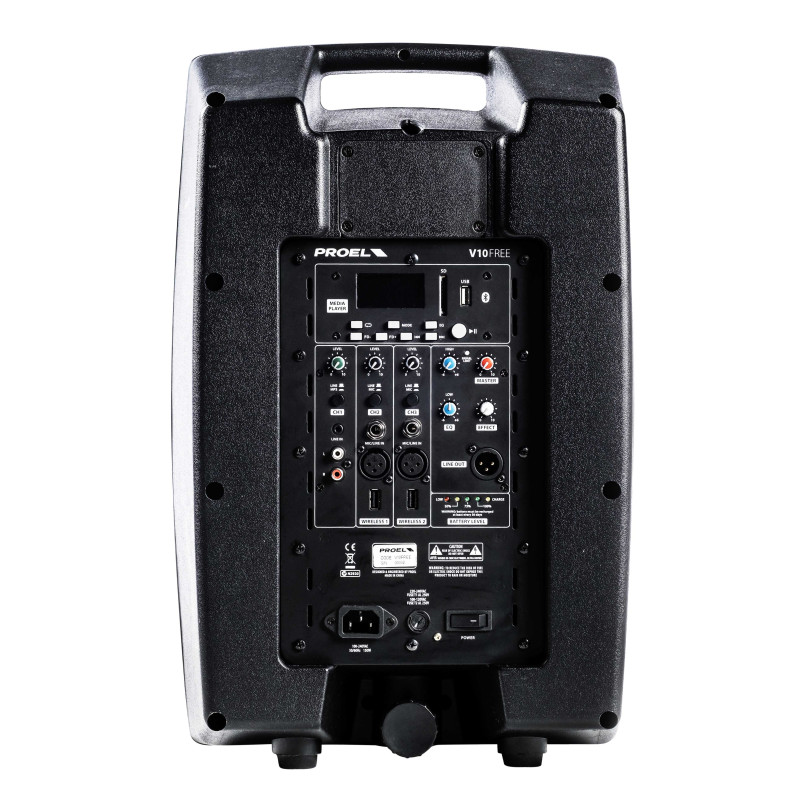 Серия портативных активных акустических систем PROEL V FREE позволит Вам выбирать места для выступлений, не задумываясь о наличии розетки и необходимости иметь связку вечно мешающих проводов, при этом обеспечит Вас великолепным звучанием. PROEL V10FREE оснащена емким аккумулятором, который питает мощный 400-ваттный усилитель, позволяя колонке работать 10-12 часов без подзарядки, а встроенный трехканальный микшер с эффектом ECHO и регулировкой тембра в купе с современным MP3-плеером и возможностью подключения по Bluetooth воспроизведет музыку с SD / USB карты или прямо со смартфона или планшета.
