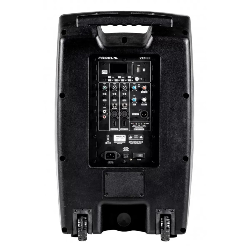 Серия портативных акустических систем PROEL V FREE позволит Вам выбирать места для выступлений, не задумываясь о наличии розетки и необходимости иметь связку вечно мешающих проводов, при этом обеспечит Вас великолепным звучанием. PROEL V12FREE оснащена аккумулятором, который питает мощный 400-ваттный усилитель, а встроенный трехканальный микшер с эффектом ECHO и регулировкой тембра в купе с MP3-плеером и возможностью подключения по Bluetooth воспроизведет музыку с SD / USB карты или прямо со смартфона.