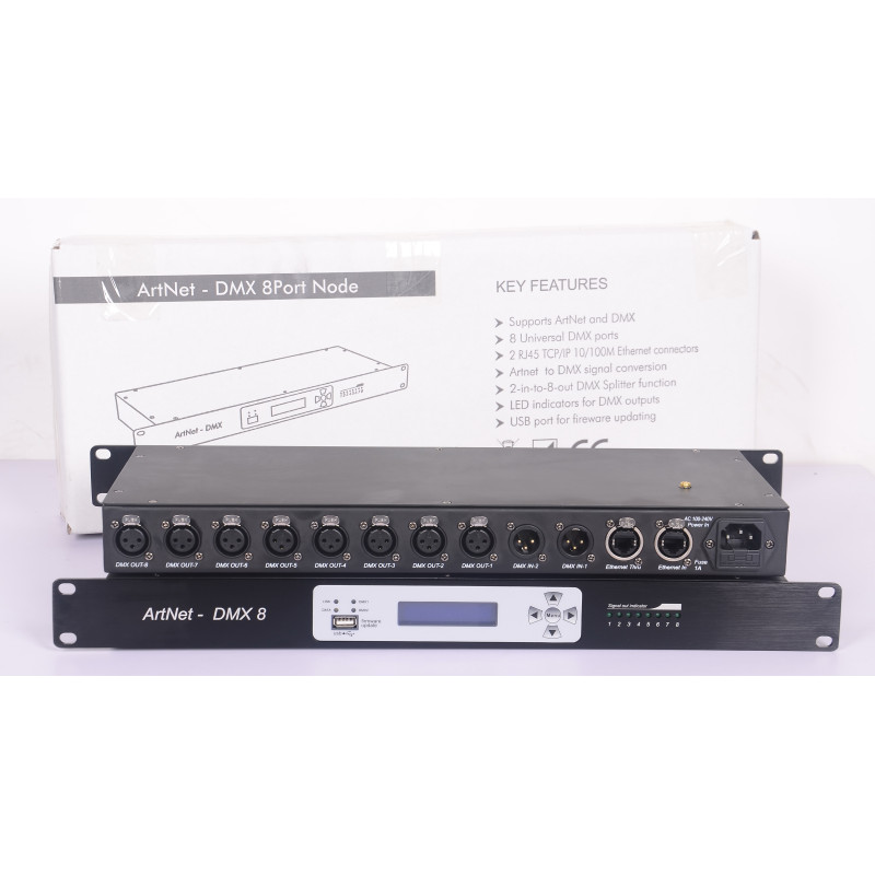 Proton ArtNet-DMX 8 Port Node универсальный высокоскоростной конвертер.В приборе предусмотрено 2 DMX входа, 8 DMX выходов и 2 Ethernet. Этот прибор спроектирован как довольно экономичный для такого класса и качества, что упрощает его использование и с другими приборами.2 DMX входа, 8 DMX выходов.Идеален для использования в проектах, где необходимо большое количество линий DMX.Отлично подойдет для постоянных инсталляций.Подходит для любого оборудования подобного типа.