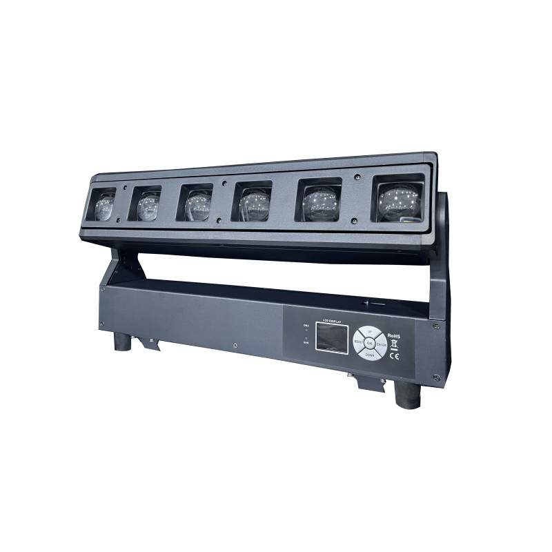 Угол раскрытия луча варьируется от 5° до 45°, что позволяет создавать как узкие, направленные лучи, так и широкие световые эффекты. С возможностью управления на 14, 18 или 32 DMX-каналах, эта панель обеспечивает высокую гибкость настройки световых параметров.