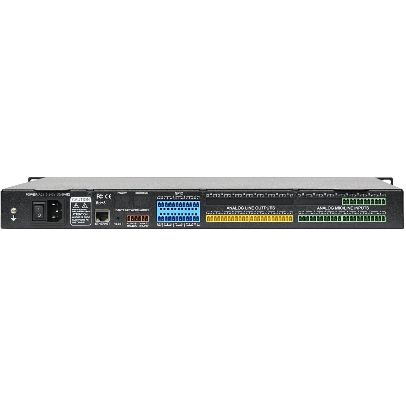 Фантомное питание ±48 В. Параметры АЦП/ЦАП – 24 бит/48 кГц. Оборудована встроенной USB-аудиокартой для записи и проигрывания цифрового аудио. Параметрический 12-полосный эквалайзер на входе и 31-полосный графический эквалайзер на выходе. Управление по IP, интерфейсами RS-232 и RS-485.Совместима с операционными системами Windows и iOS.