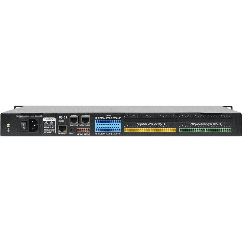 | Порты | 2 – Dante, разъем RJ45 (розетка) 1 – Ethernet, разъем RJ45 (розетка) 8 – GPIO, клеммный блок 1 – RS-232, клеммный блок 1 – RS-485, клеммный блок |