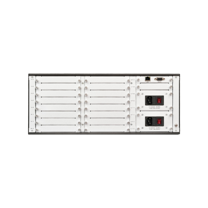 Размерность коммутатора может меняться от 2x2 до 16x16 с шагом в 2 порта в зависимости от количества установленных входных и выходных плат. Возможные разрешения сигнала у плат 2K составляют до 1080p, у плат 4K – до 3840x2160/60 (4:4:4). Модули для данного шасси могут быть оборудованы портами HDMI, DVI-U (HDMI/DVI/VGA/YUV/CV), HDBaseT, SDI и оптическими. У устройства есть функция построения видеостен. Управление осуществляется по RS-232 и Ethernet (TCP/IP, web-интерфейс).