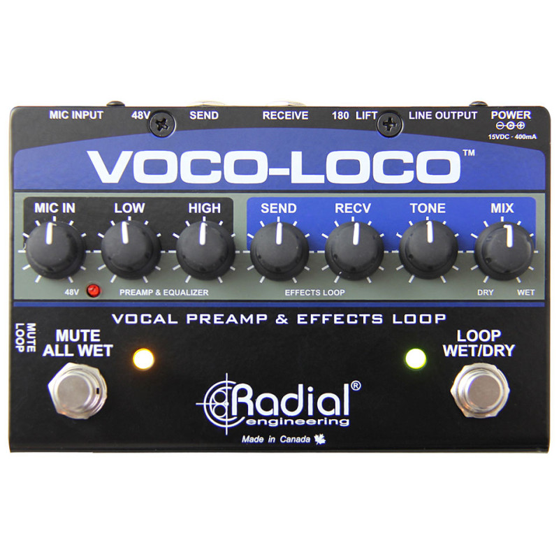 VOKO-LOCO - микрофонный предусилитель с петлёй эффектов с ножным управлением, позволяющий ведущим вокалистам, музыкантам включать гитарные педали эффектов в цепь сигнала, так же, как электро гитарист добавляет эффекты для соло. Встроенное фантомное питание 48 В позволяет использовать конденсаторные микрофоны, Регулировки позволяют корректировать тембры сигнала, а также смешение исходного сигнала с сигналом эффектов.