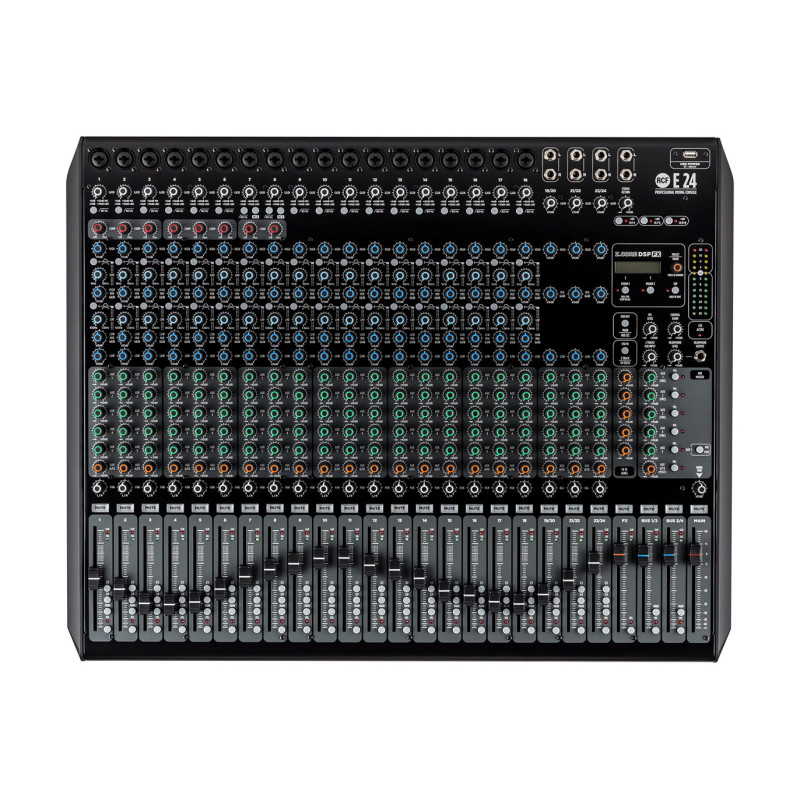 RCF E 24 представляет собой 24-канальный аналоговый микшерный пульт, оборудованный цифровым процессором эффектов.