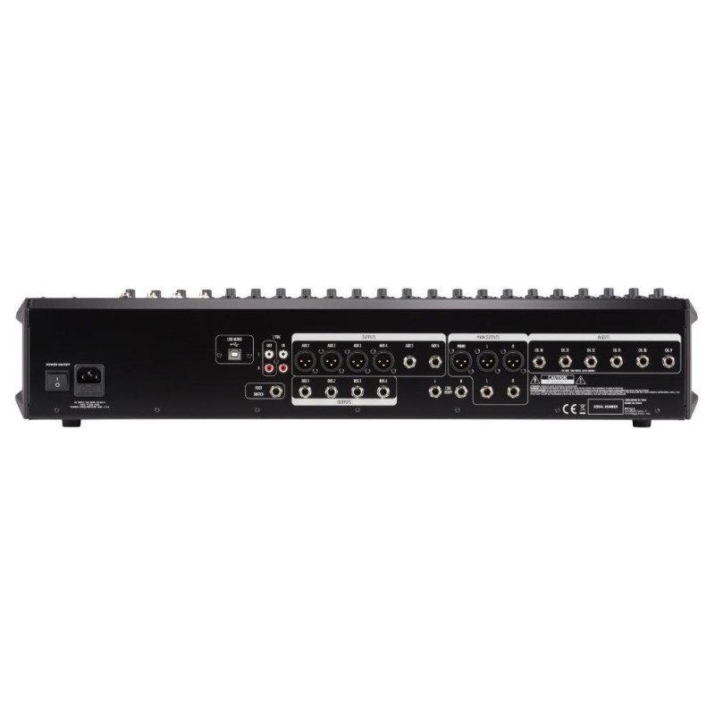 | Входы | каналы 1-18: 1 x XLR/Jack mic/line in (каналы 9-14: 1 x 1/4” Jack TRS insert send/return) каналы 19/20-23/24: 2 x 1/4” Jack TRS line in 2 x 1/4” Jack TRS return in, 2 x RCA line in, 1 x 1/4” Jack TS footswitch in |