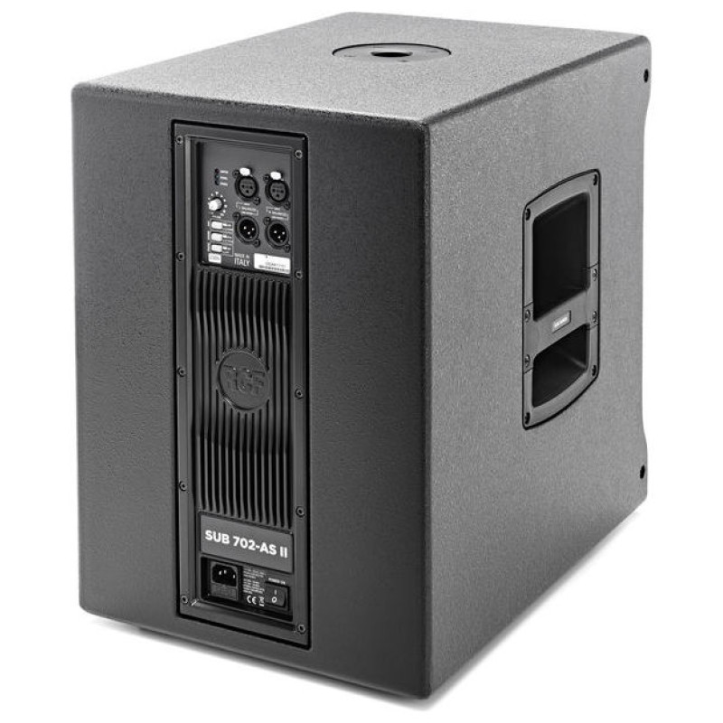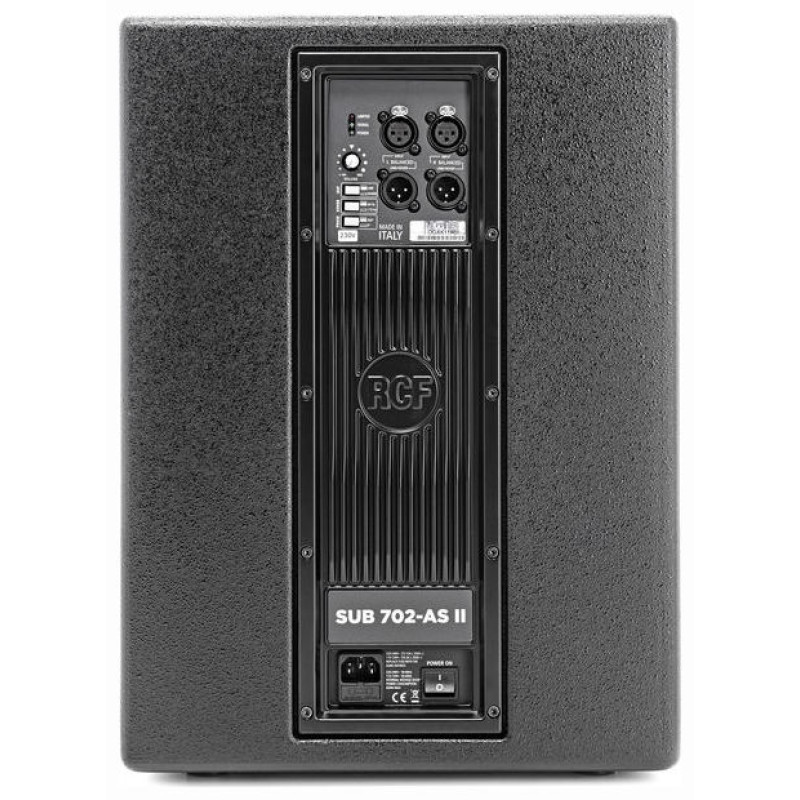 RCF SUB 702-AS II Активный сабвуфер 700 Вт, 40 Гц-120 Гц, 129 дБ, 12" динамик (2.5" v.c.), линейный стерео вход: 2 х XLR, переключатель частоты раздела кроссовера 80-110 Гц, переключатель фазы, стерео выход: 2 х XLR, стерео выход кроссовера для сателлитов: 2 х XLR, деревянный корпус, 487х354х498 мм, 17,5 кг, возможность установки штатива для сателлита.