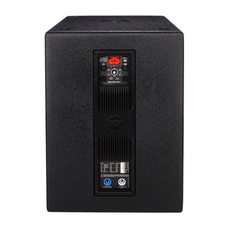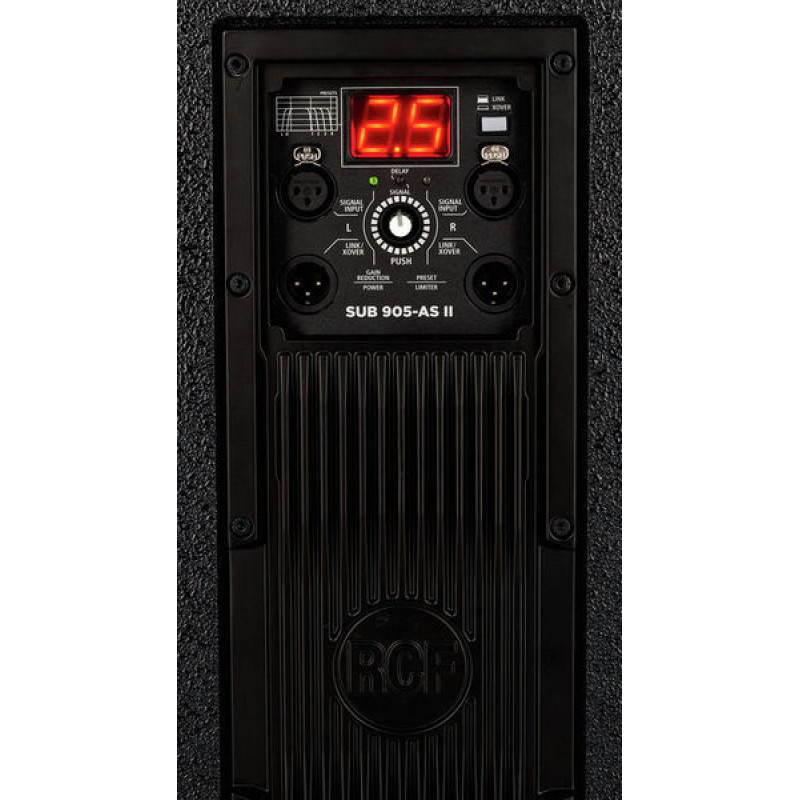 RCF SUB 905-AS II Активный сабвуфер, усилитель D-класса 1100 Вт, 40 Гц-120 Гц, 133 дБ, динамик 15"(3" v.c.), линейный стерео вход: 2 х XLR, встроенный DSP с пресетами, стерео выход или стерео выход кроссовера для сателлитов: 2 х XLR, деревянный корпус, 600х445х610 мм, 31 кг, возможность установки штатива для сателлита.