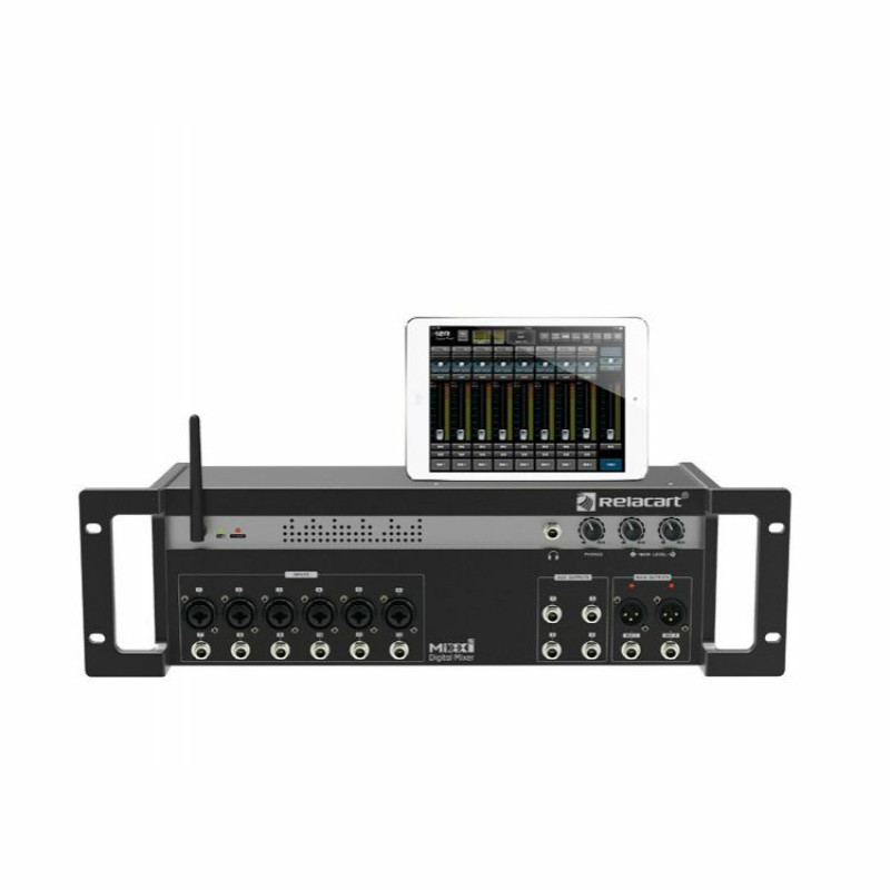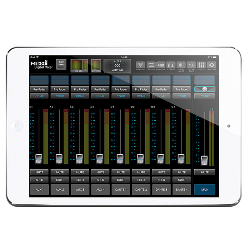 Микшерный пульт MIXX12 -это цифровой микшер, устанавливаемый на специальную стойку. Управление им осуществляется посредством приложения на планшетном компьютере. Подключив устройство к WiFi можно выполнить синхронизацию с системами iOS, Android или Windows. Микшерный пульт MIXX12 поддерживает протокол Dante благодаря встроенной карте DANTE. Он предполагает 12 входных каналов для микрофонного усилителя и 6 выходов: 2 основных выхода и 4 вспомогательных.