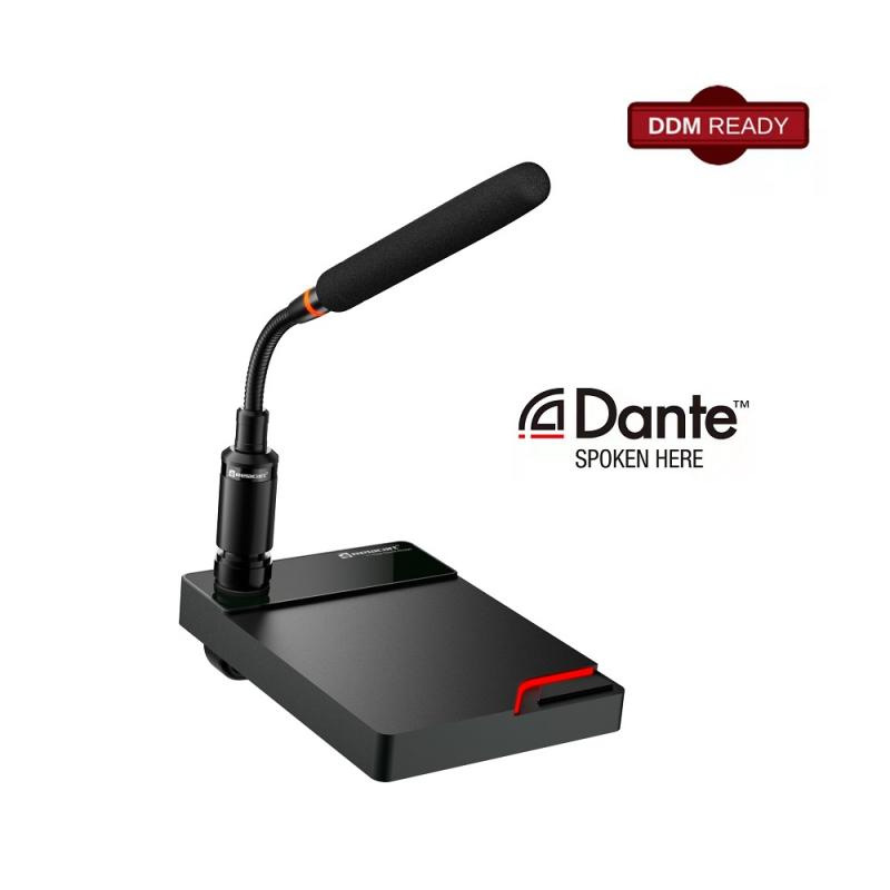 Relacart TDN-1 — это микрофонная база с интерфейсом Dante™, к которой можно подключить любой микрофон «на гусиной шее» с фантомным питанием и разъёмом XLR-M 3-pin.