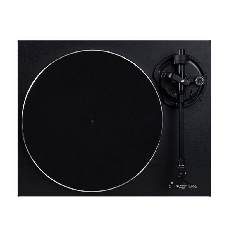 Reloop Turn2 black представляет собой аналоговый Hi-Fi проигрыватель винила, адресованный аудио пуристам. Очень точный ременной привод обеспечивает постоянство скорости вращения диска, а встроенный DC двигатель с низкой вибрацией практически не шумит, при этом скорость может переключаться между 33,1/3 и 45 RPM с помощью расположенного в нижней части шасси переключателя. Проигрыватель оснащен статически сбалансированным прямым тонармом с установленным под углом звукоснимателем и картриджем Ortofon, который идеально следует канавке пластинки. Ручной лифт дает возможность точно опускать иголку. На задней панели расположены золоченые разъемы RCA, разъем для подключения внешнего DC питания и отдельный разъем заземления для предотвращения земляных петель. Все разъемы являются съемными, что позволяет легко их заменять при ремонте или апгрейде. Довольно тяжелое, но тонкое основание выполнено из MDF, а литой, имеющий большую инерцию алюминиевый диск с хромированным краем гармонично завершает элегантный минималистский дизайн проигрывателя Turn2. В комплект входит диск, крышка, две петли для крышки, противовес, Phono RCA кабель, DC блок питания с адаптерами, войлочный мат, руководство пользователя и звукосниматель Ortofon OM10.