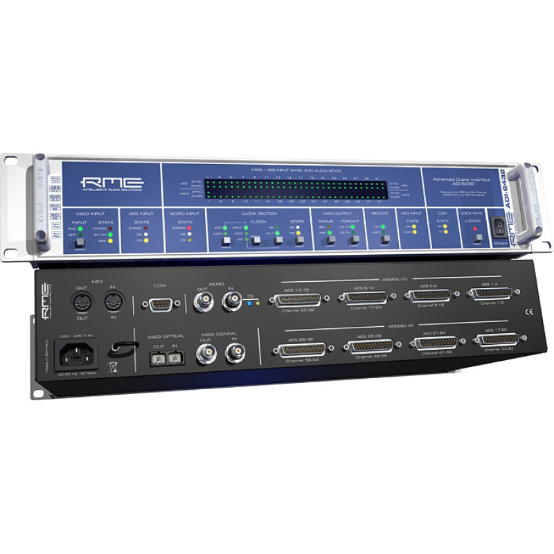 RME ADI-6432 64-канальный конвертор цифровых форматов. В RME ADI 6432 есть: Madi-вход: 1 BNC, 1 оптический; Madi-выход: 1 BNC, 1 оптический; AES / EBU-вход: 32/4-х на D-Sub разъем, трансформатор сбалансированный, SPDIF совместимый; AES / EBU-выход: 32/4-х на D-Sub разъем, трансформатор сбалансированный, 4 Vpp; MIDI вход и выход: два 5-контактных DIN-разъема; COM-порт: RS232 9-контактный D-Sub, 9600/19200/115200; Частоты дискретизации: 44,1 кГц, 48 кГц, 88,2 кГц, 96 кГц, 176,4 кГц, 192 кГц; Частотный диапазон: Madi: 32 - 192 кГц, Word Clock: 27 кГц - 200 кГц, AES: 28 кГц - 200 кГц. Габариты RME ADI-6432: 483/88/200 мм.