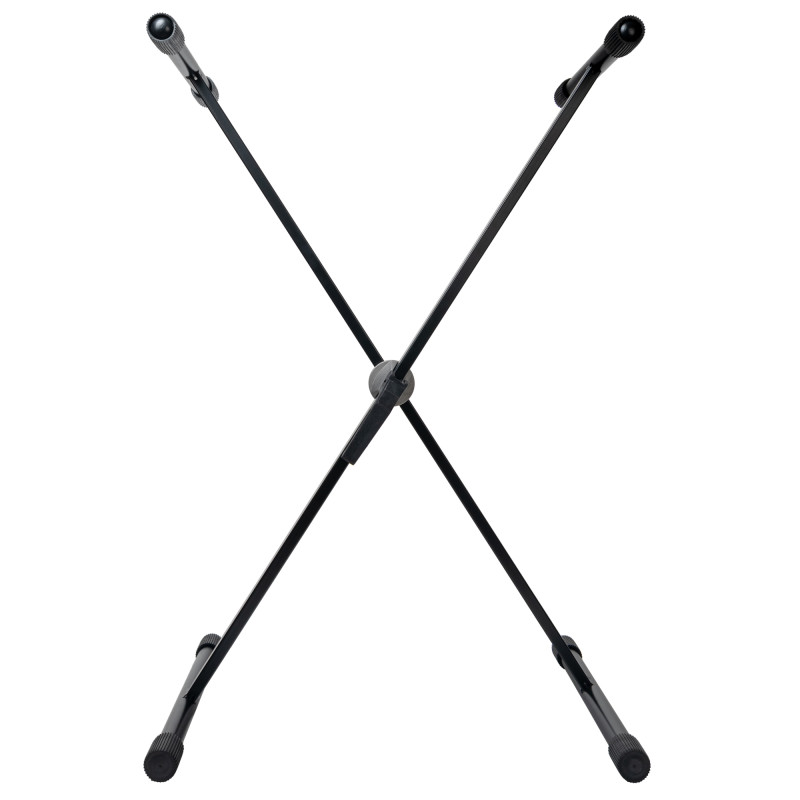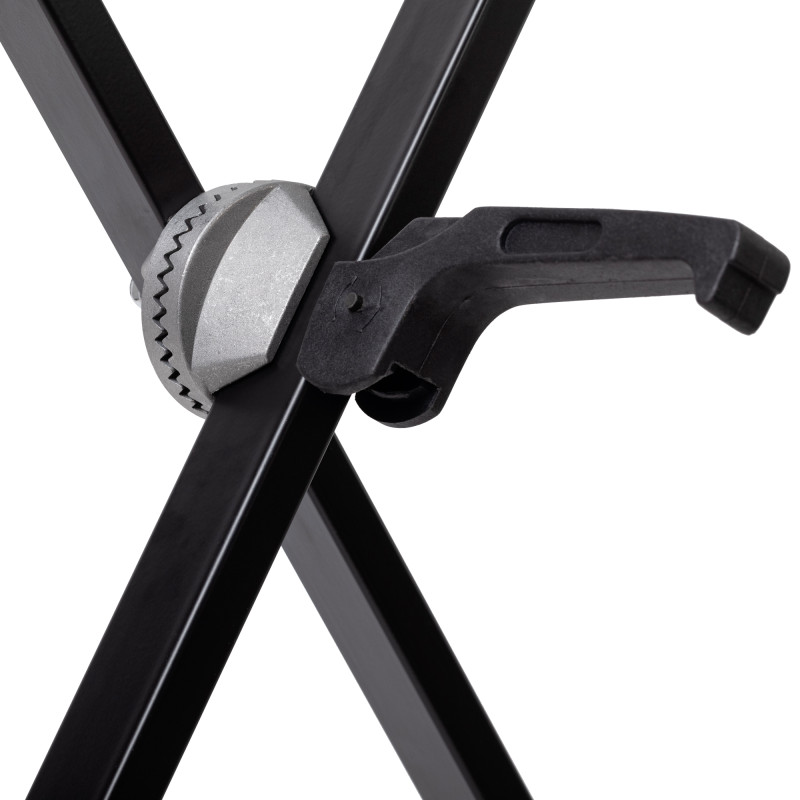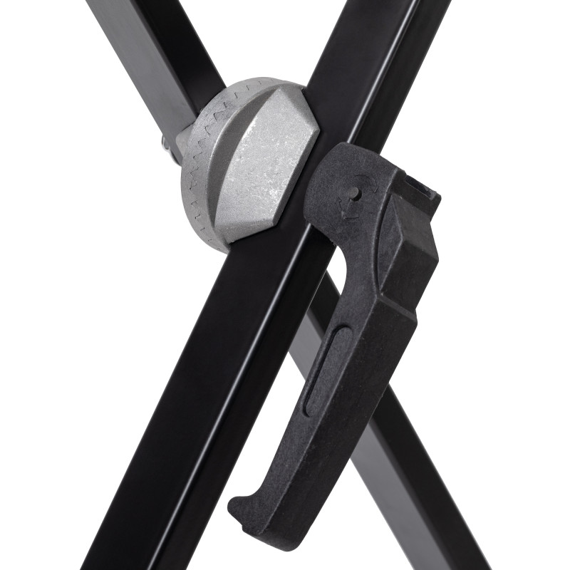 Конструкция складного и регулирующего элемента стойки основана на проверенном временем классическом зубчатом механизме и дополнена удобной ручкой для быстрой регулировки и фиксации. В сложенном состоянии стойка занимает всего 100 см в длину, в раскрытом состоянии ширина основания 39 см, а ширина верхней части 34 см. Вес стойки 2,3 кг. Она подойдет как для домашнего использования, так и для концертной и репетиционной деятельности. Подходит для синтезаторов.