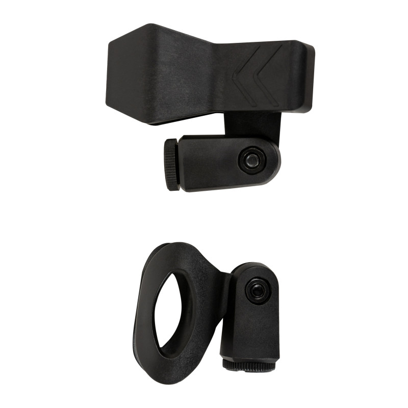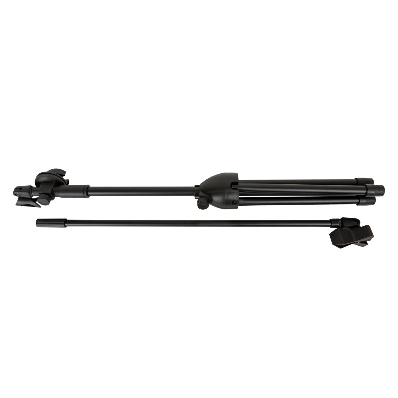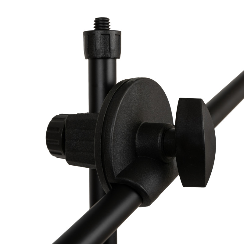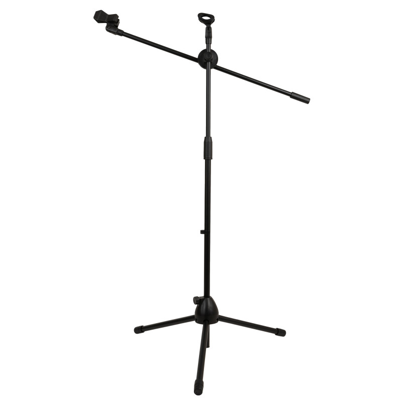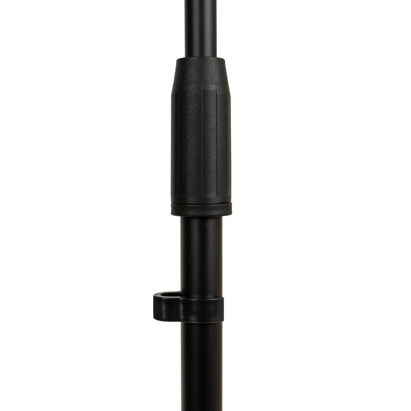 Стойка комплектуется двумя классическими микрофонными держателями – для проводного и для беспроводного (на прищепке) микрофонов. Длина регулируемого по углу наклона журавля составляет 80 см, а устойчивость стойке придают резиновые насадки на ножках, препятствующие скольжению и гасящие нежелательные вибрации.