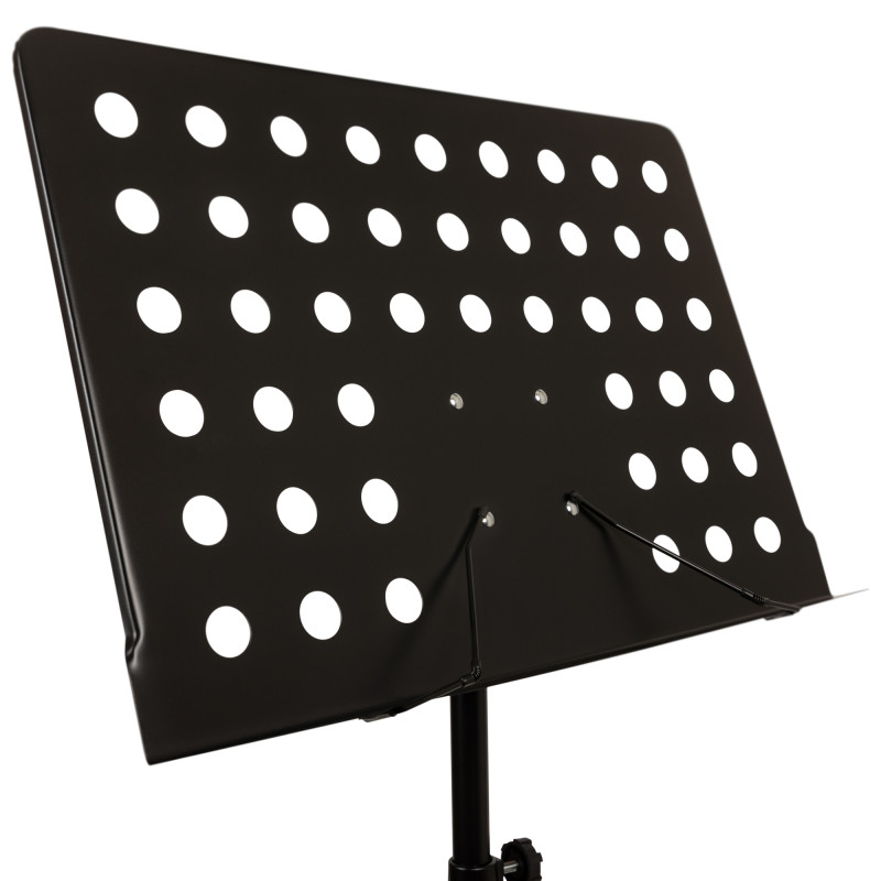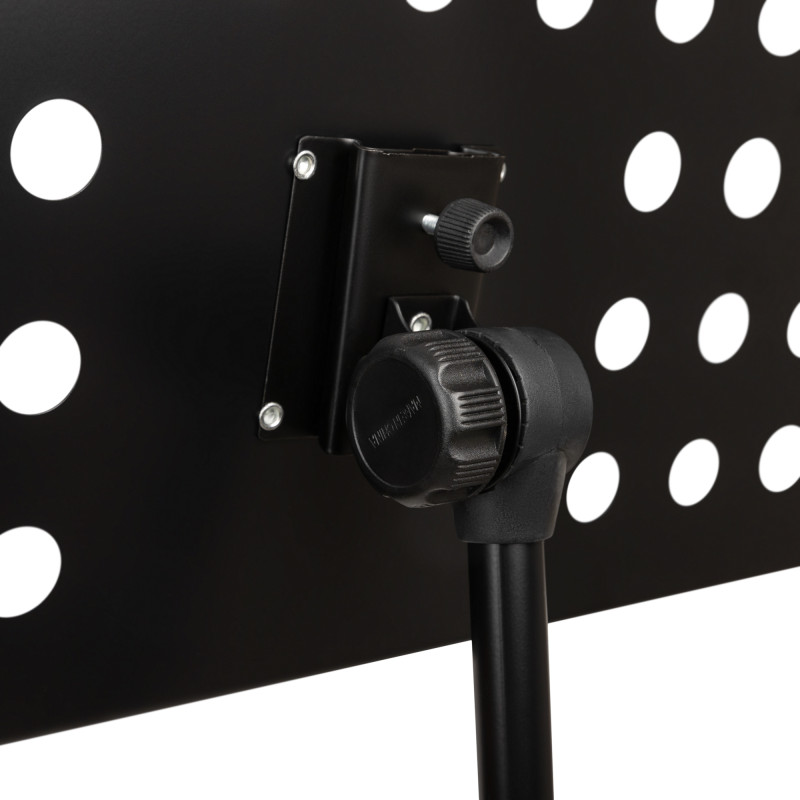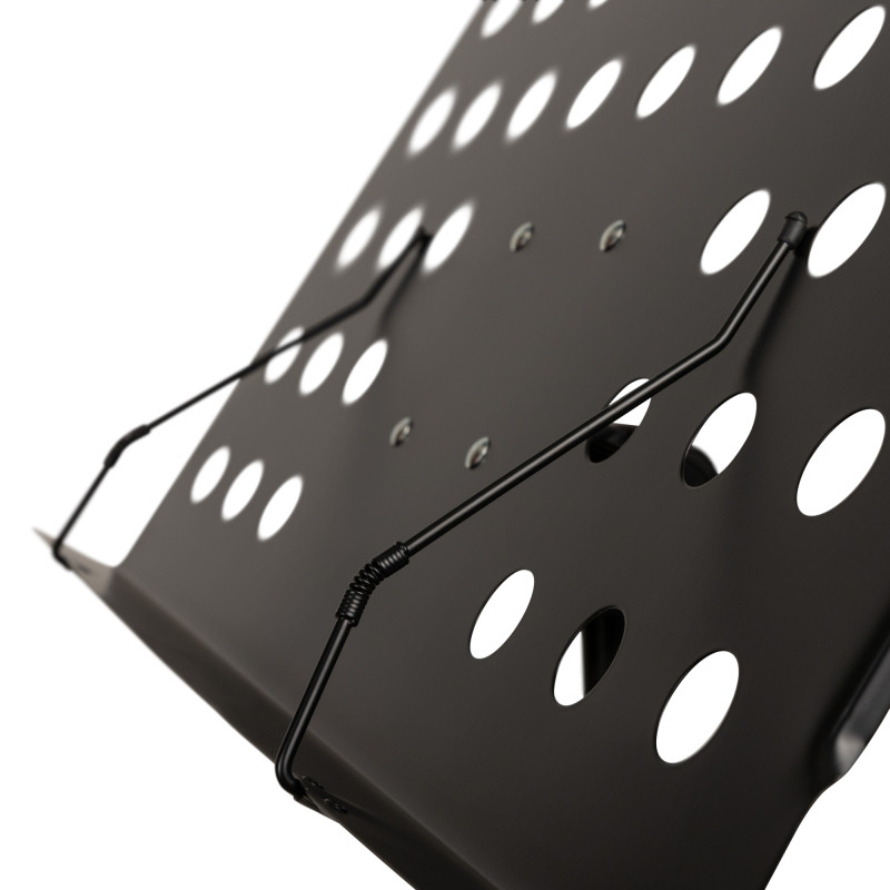 Перфорация полотна необходима не только для снижения веса пюпитра, но и позволяет получить больше естественного освещения с обратной стороны нотного листа. Размер полотна для нот составляет 49x34 см и на нем имеются специальные зажимы для предотвращения соскальзывания. Высота ROCKDALE P-06 регулируется от 75 до 142 см, в связи с чем он подойдет как ребенку, так и взрослому в сидячем и стоячем положениях.