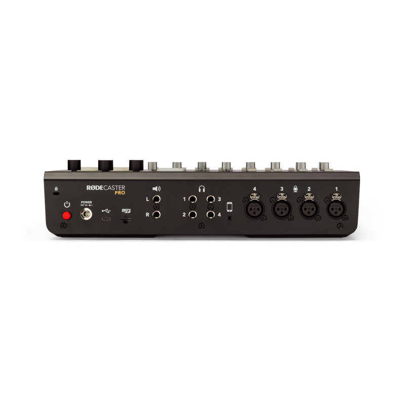 RODE Caster Pro - цифровая студия для интернет-вещания и Podcast с процессором эффектов, вход: 4 микрофонных канала, фантомное питание +48В, 3 стерео канала - USB, аналоговый стерео джек 3,5 мм, Bluetooth, выход 2 х балансных ждека 6.3 мм, 4 выхода на наушники стерео джек 6.3 мм, USB-C, слот для microSD™ card, габариты 350 x 275 x 82 мм, масса 1,98 кг, в упаковке габариты 412 x 338 x 127 мм, масса 2,85 кг