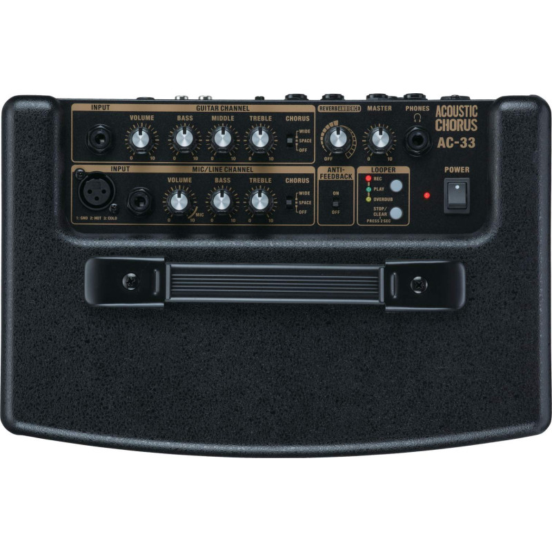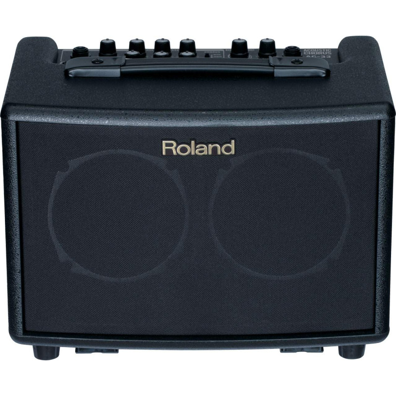 Комбо-усилитель AC-33 содержит последние технологические наработки Roland. Он дает чистый, богатый звук, распространяющийся гораздо дальше, чем позволяет предположить его размер. Его стереофонический дизайн (2 * 15 Вт) позволяет использовать эффектный многополосный хорус в режиме Wide, расширяющий стереобазу, а также глубокую реверберацию и трехмерный эффект имитации акустики помещения (ambience), отстроенные специально для акустической гитары.