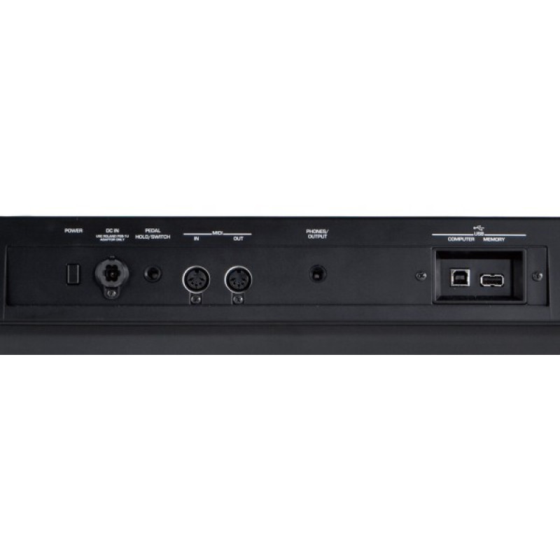 Разъёмы: MIDI IN, MIDI OUT, выход/разъём для наушников6,3мм, USB-to-HOST (MIDI), USB к устройству (USB Стик), Sustainpedal Джек, Speakersystem 2х7,5Вт,