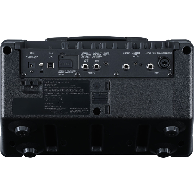 Комбо оснащен двумя динамиками по 6.5 дюймов, на каждый из которых приходится до 5 Вт выходной мощности. В режиме Eco общая выходная мощность равняется 5 Вт, а в режиме Max – 10 Вт. Для вывода аудиосинала на внешнюю акустическую систему есть монофонический линейный выход на разъеме 1/4'' Jack TS, а для подключения наушников есть выход на разъеме 1/8'' Jack TRS, который также можно использовать для записи аналогового сигнала. Для записи, стримминга и воспроизведения пользовательских композиций есть вход/выход i-CUBE на разъеме 1/8'' Jack TRRS (4-контактный кабель в комплекте). Наконец, есть два входа на разъемах 1/4'' Jack TRS для опциональных футсвичей, с помощью которых можно управлять эффектами. Подходят модели FS-5U, FS-6 или FS-7 от компании BOSS.