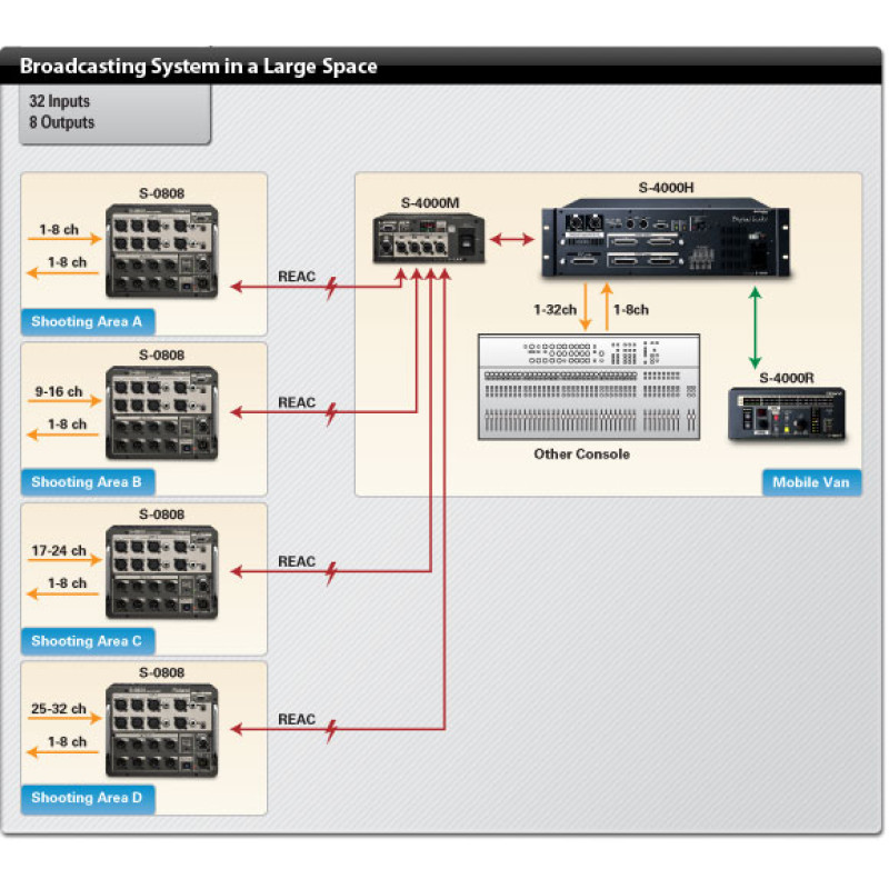 - Режим объединения REAC-сигналов с 4 таких устройств типа Digital Snake, как S-0808, S-1608 и S-4000, в 1 мастер-сигнал REAC