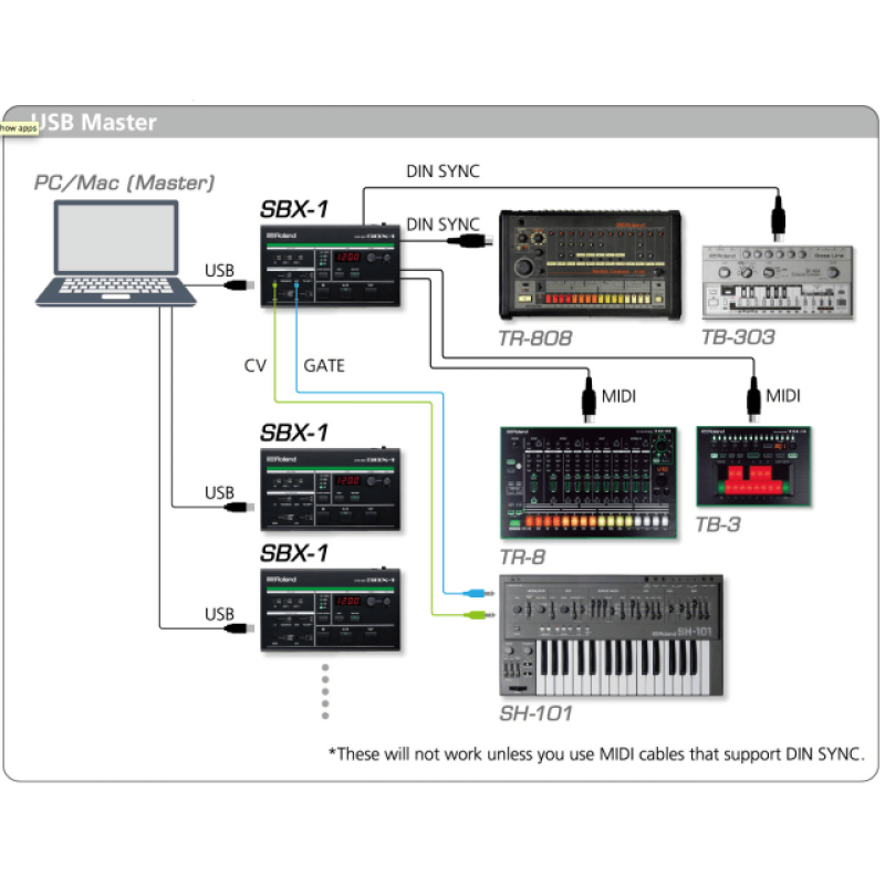 SBX-1 позволяет синхронизировать между собой компьютеры и электронные инструменты. Он поддерживает широкий спектр аналоговых и цифровых инструментов с DIN SYNC, MIDI и USB соединением и каждый из них может быть мастер устройством. Вы также можете сделать SBX-1 мастер устройством и с небывалой стабильностью контролировать другие инструменты. С поддержкой режимов «over timing», «groove» и CV/GATE портов, SBX-1 становится лучшим помощником, связывающим инструменты из разных столетий.