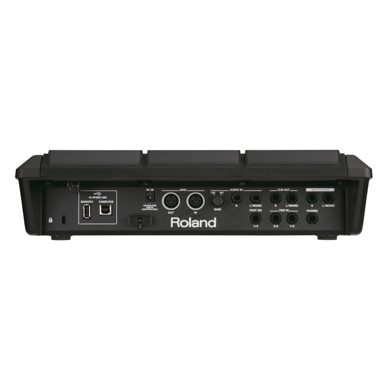 - Разъемы: под наушники на джеке 1/4 дюйма, 2 мастер-выхода на 1/4 дюйма джеках (R, L/MONO), 2 выхода SUB на 1/4 дюйма джеках (R, L/MONO), входы аудио на джеках 1/4 дюйма (R, L/MONO) с переключателем гейна, 2 входа триггерных (1/2 и 3/4) на джеках 1/4 дюйма TRS, разъем FOOT SW для ножного контроллера на джеке 1/4 дюйма TRS, порт USB и порт для компьютера, MIDI вход и выход.