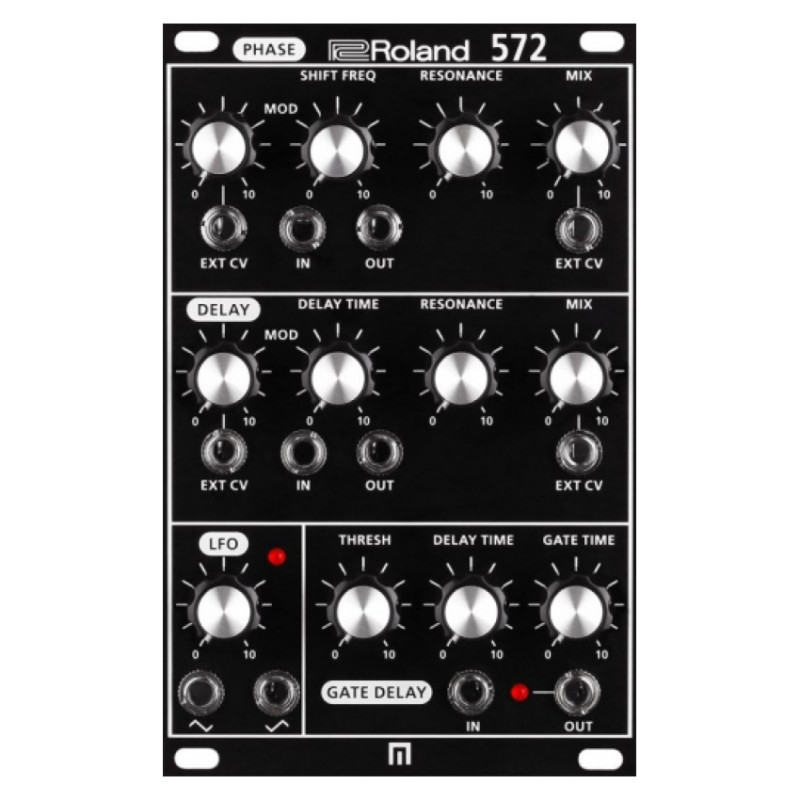 572 Phase Shifter, Delay и LFO - Это мульти-эффектор, основанный на времени. 572 включает пяти-ступенчатый фейз шифтер, аналоговый дилей, гейт-дилей, управляемый напряжением и LFO. Фейз шифтер имеет управление частотой и диапазоном резонанса, варьирующимся от едва заметного до глубокого, яркого аналогового эффекта. Точно так же, дилей имеет независимые регуляторы времени дилея и резонанса (или фидбека) для коротких модуляций дилея с эффектом хоруса. Вместе фейз шифтер и дилей может модулироваться встроенной огибающей от 572 модуля или внешними CV сигналами и настраиваться по силе эффекта с панели или CV сигналов.
