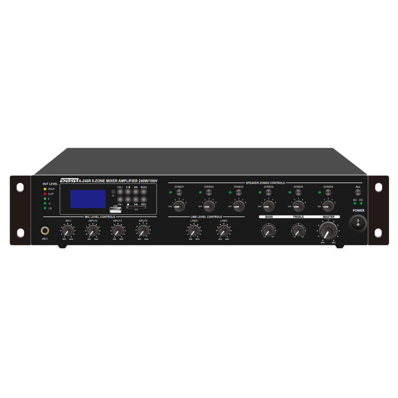 Поддерживает 6 зон вещания. Выходная мощность 240 Вт. Благодаря встроенному плееру может воспроизводить звук без сторонних источников. Модули Bluetooth, FM-тюнера и порты USB/SD-card покрывают все возникающие потребности в источниках музыки. Усилитель прекрасно подойдёт для ресторанов, лобби отелей, ТРЦ, магазинов, АЗС и т.п.