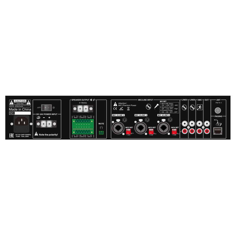 Усилитель имеет богатое оснащение различными разъёмами. 6 аудиовходов: 3 комбинированных, линейные/микрофонные, небалансные, 1 микрофонный (балансный) с приоритетностью - когда сигнал поступает от него, остальные глушатся - и 2 линейных (небалансные). Максимальная приоритетность задана вспомогательному входу EMC (2RCA), который наряду с исполнительным реле MUTE ("сухой контакт", блокирует трансляцию) отвечает за интеграцию системы звукофикации объекта в системы ответственные за ГО и ЧС. Аудиовыходы: 1 линейный 2RCA, для внешнего устройства, например, рекордера и винтовые зажимы для акустики 4-16 Ом + Euroblock для зональной акустики 100В.