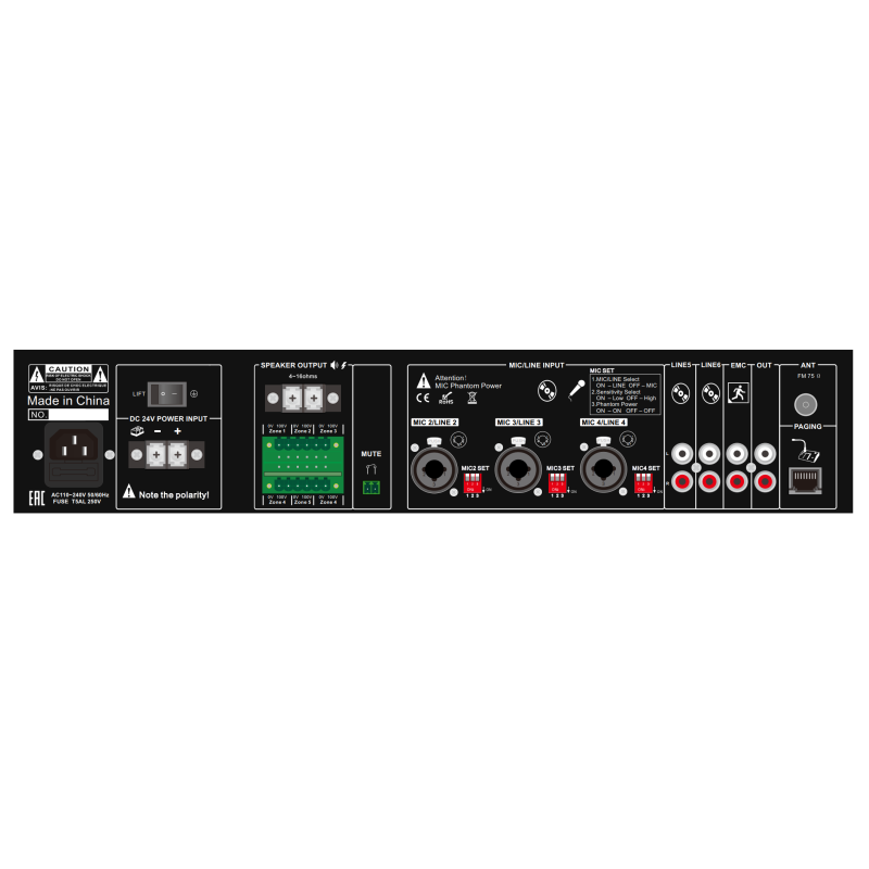 Усилитель имеет богатое оснащение различными разъёмами. 6 аудиовходов: 3 комбинированных, линейные/микрофонные, небалансные, 1 микрофонный (балансный) с приоритетностью - когда сигнал поступает от него, остальные глушатся - и 2 линейных (небалансные). Максимальная приоритетность задана вспомогательному входу EMC (2RCA), который наряду с исполнительным реле MUTE ("сухой контакт", блокирует трансляцию) отвечает за интеграцию системы звукофикации объекта в системы ответственные за ГО и ЧС. Аудиовыходы: 1 линейный 2RCA, для внешнего устройства, например, рекордера и винтовые зажимы для акустики 4-16 Ом + Euroblock для зональной акустики 100В.