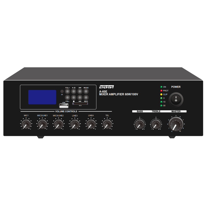 Микшер-усилитель с медиаплеером A-60E является отличным решением от бренда RORSYS при организации системы фонового/сопроводительного музыкального вещания и/или голосового оповещения на объектах небольших и средних площадей.