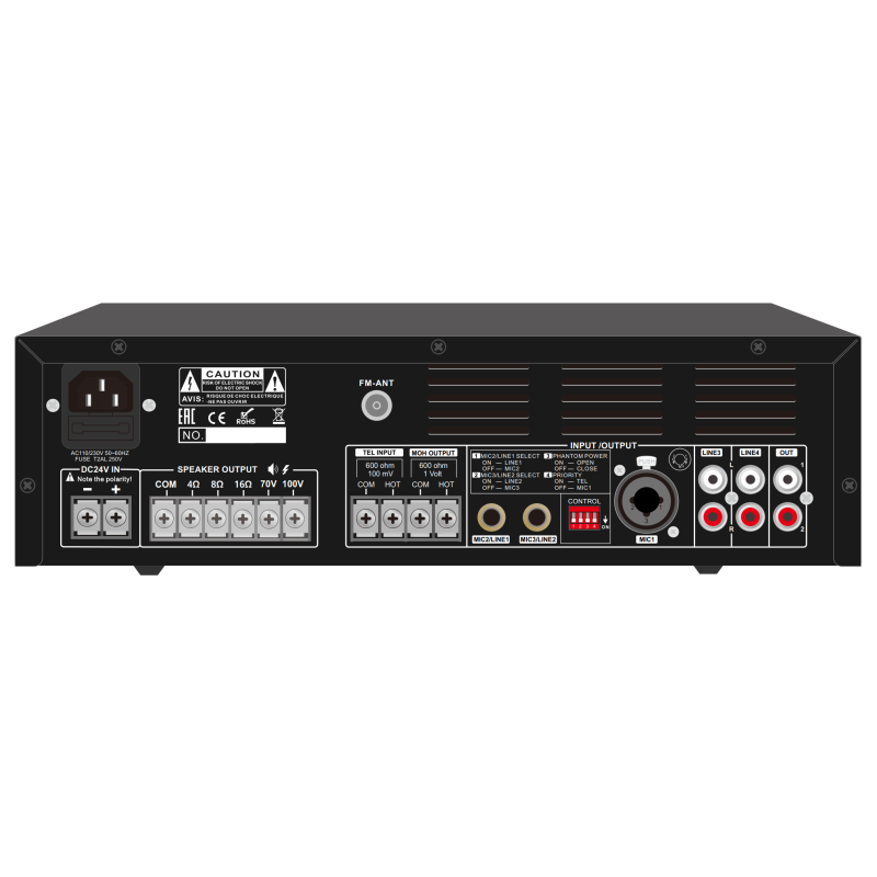 Усилитель имеет богатое оснащение различными разъёмами. 5 аудиовходов: 2 линейных, разъемы 2RCA; 2 комбинированных, линейные/микрофонные, разъемы Jack 6,35мм, предусмотрены переключатели уровня сигнала и подключение фантомного питания микрофонов; 1 микрофонный, универсальный, разъем XLR/Jack 6,35мм, приоритетный вход - когда сигнал поступает от него, остальные глушатся. Аналогичная приоритетность задана и телефонному входу (TEL INPUT, винтовые клеммы). Аудиовыходы: 1 линейный, 2RCA, для подключения внешних акустических приборов; винтовые клеммы для колонок; выход в телефонную сеть MOH OUTPUT позволяет транслировать в телефонную сеть музыку вместо гудков, в случае, когда приходится ожидать при звонке.