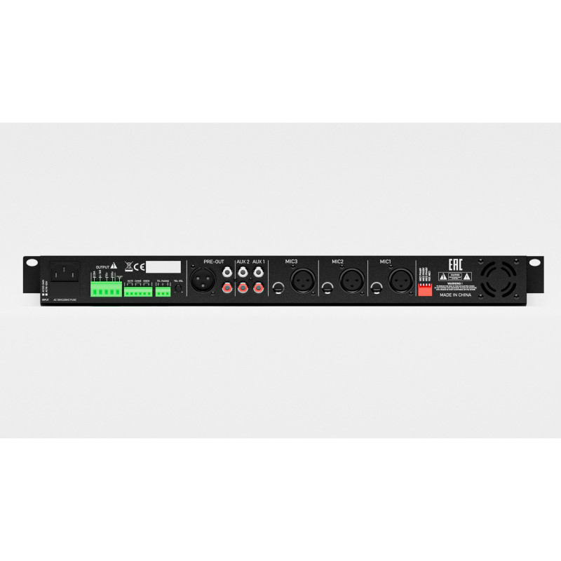 Один канал, мощность на выходе составляет 120 Вт. Возможно подключение как трансляционных (напряжение в линии 70/100В), так и низкоомных (импеданс линии 4-16 Ом) акустических систем. Важно отметить, что одновременно можно применять акустику только одного типа. Диапазон воспроизводимых частот 80 Гц - 20 кГц.