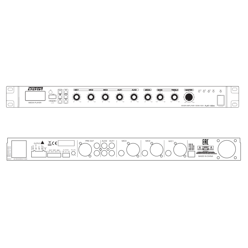 Микшер-усилитель с медиаплеером FLAT-120m является хорошим решением при организации системы фонового/сопроводительного музыкального вещания и/или голосового оповещения на объектах небольших площадей.