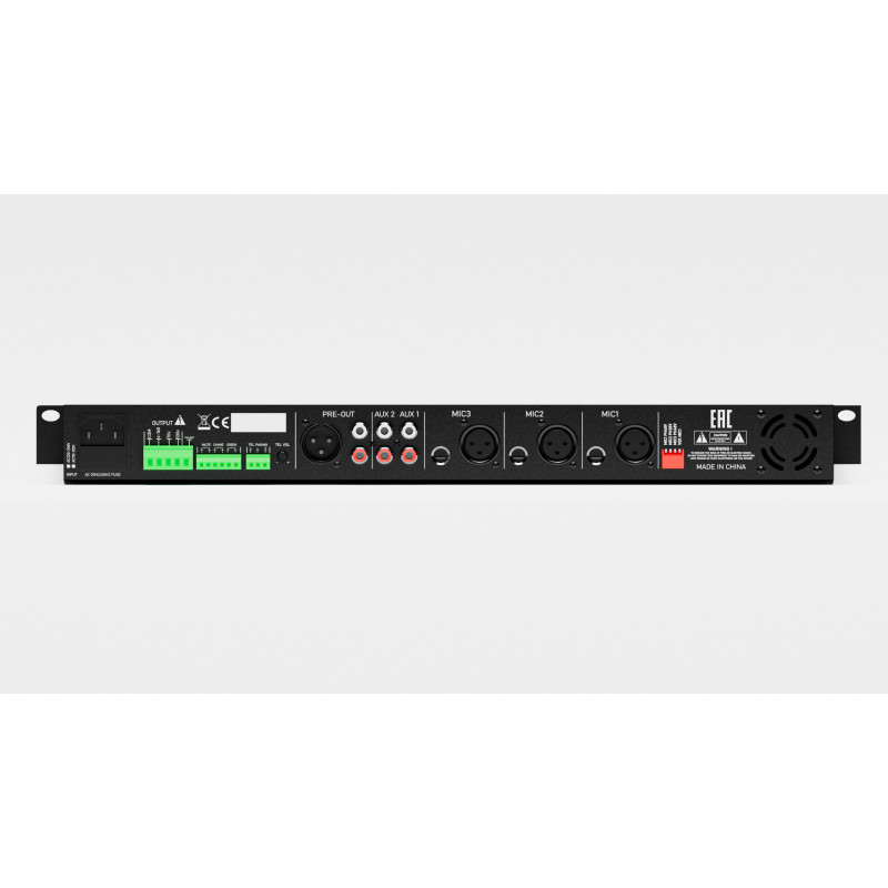 Один канал, мощность на выходе составляет 60 Вт. Возможно подключение как трансляционных (напряжение в линии 70/100В), так и низкоомных (импеданс линии 4-16 Ом) акустических систем. Важно отметить, что одновременно можно применять акустику только одного типа. Диапазон воспроизводимых частот 80 Гц - 20 кГц.