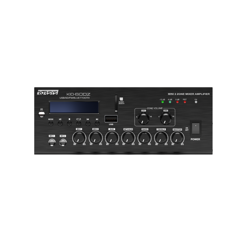 Зональный микшер-усилитель с медиаплеером KID-60Dz является отличным решением при организации системы фонового/сопроводительного музыкального вещания и/или голосового оповещения на объектах небольших или средних площадей, включающих в себя две (2) зоны вещания.