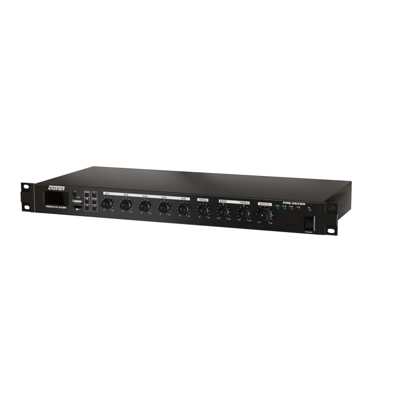 Лицевая панель PRE-MIXER имеет стильный дизайн. На ней размещен цветной текстовый экран медиаплеера с синей подсветкой, кнопки для его управления, общий регулятор громкости и регулятор громкости плеера, слоты для USB/TF-носителя, двухполосный эквалайзер (НЧ + ВЧ) и регуляторы громкости для каждого из входов.