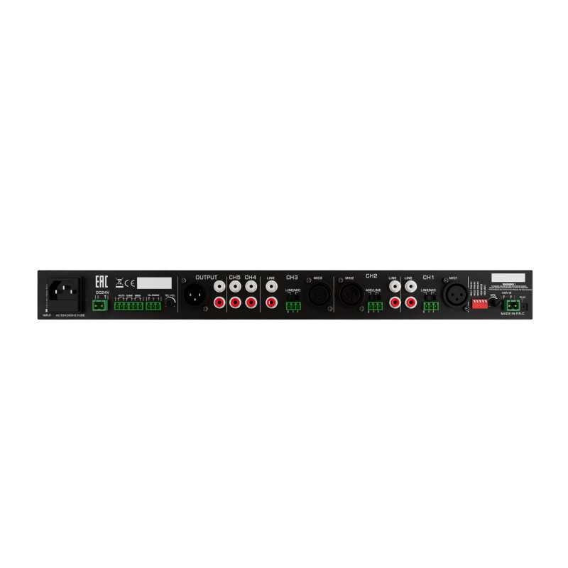 Предусилитель имеет богатое оснащение различными разъёмами. Пять аудиовходов: 3 комбинированных, микрофонно-линейных, разъемы XLR/2RCA, с переключателями уровня сигнала (мик/лин), подключаемым фантомным питанием микрофонов (+48В) и активируемым приоритетом для микрофонных входов №№1 и 2 (приоритетность входа №1 максимальная); 2 линейных входа на разъемах 2RCA. Один линейный аудиовыход, разъемы XLR/2RCA, на котором формируется суммарный стереофонический, балансный/небалансный, звуковой сигнал. Три управляющих реле, MUTE/CHIME/SIREN ("сухой контакт"), поступление на них внешних сигналов блокирует вещание со всех входов кроме максимально-приоритетных (любое из реле) и запускает сигналы Гонг или Сирена. Дополнительно предусмотрены служебные входы: TEL.PAGING, разъем Phoenix 3-pin, максимальный приоритет, используется с целью интеграции усилителя (всей системы) в аналоговую телефонную сеть; линейный вход 100V IN, разъем Phoenix 2-pin; у каждого из дополнительных входов есть свой отдельный регулятор громкости. Коннекторы на тыльной части корпуса.