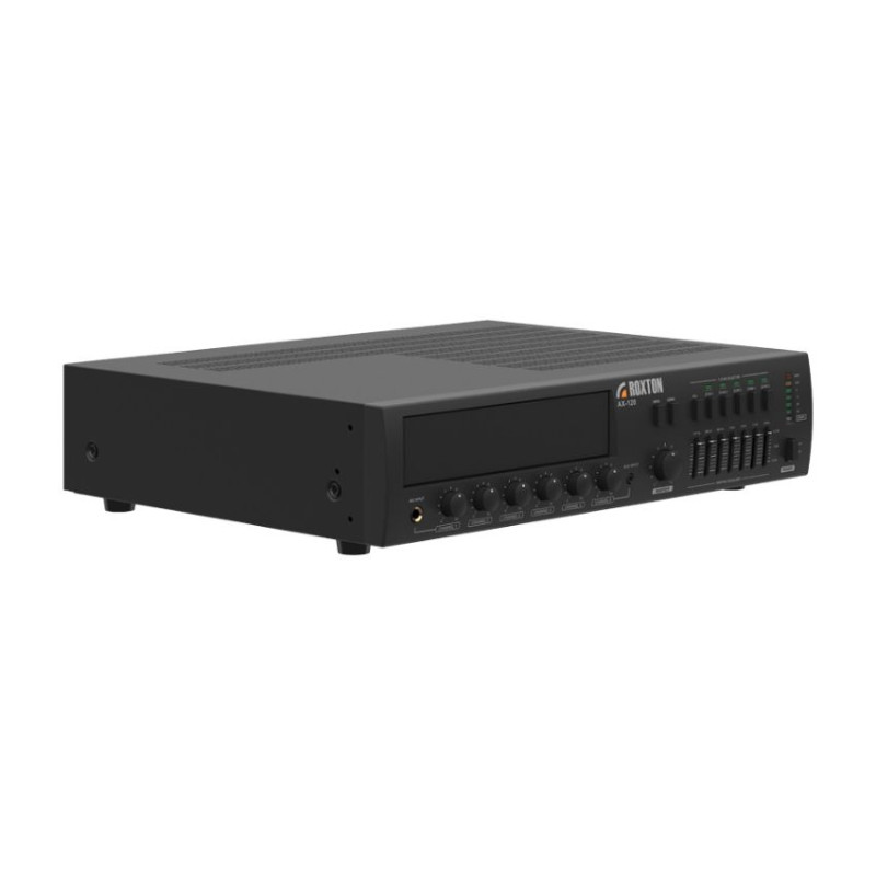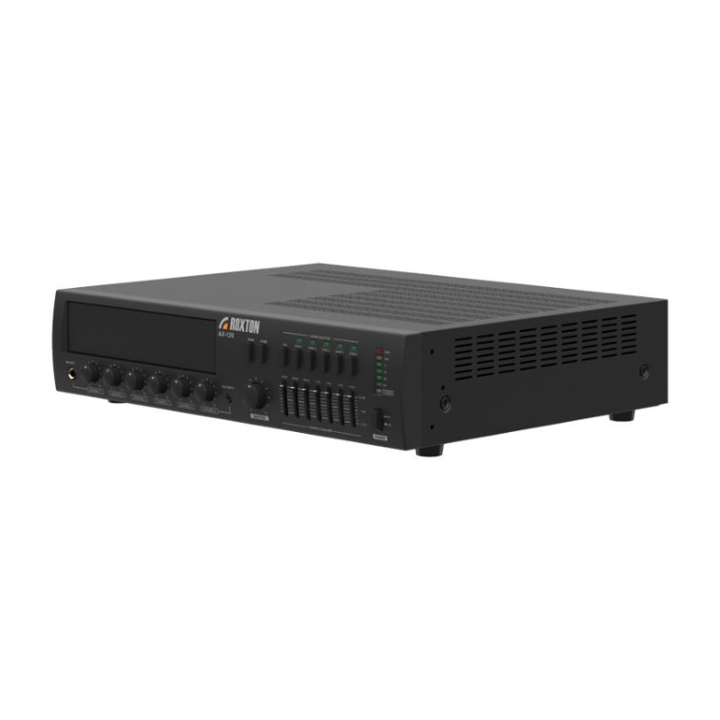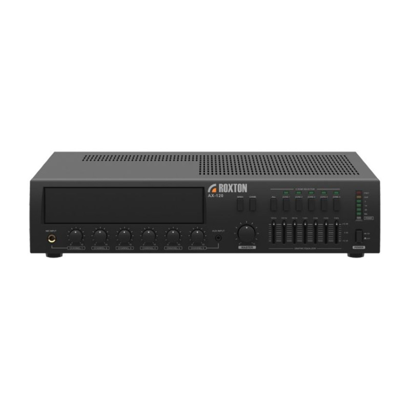 Встроенный селектор зон, коммутирующий высоковольтные выходы усилителя с пятью линиями громкоговорителей даёт возможность выбора, в какие зоны транслировать аудиосигнал. Помимо этого, ROXTON AX-120 оборудован 7-ми полосным графический эквалайзером выходного аудиосигнала позволяющего получать требуемую выразительность и громкость звучания транслируемой музыки и речи. Применение усилителя класса D и импульсный блок питания позволили добиться снижения веса усилителя и уменьшения потребляемой энергии без потери качества транслируемого звука. Сочетание огромного количества функций, простоты использования и надёжности сделали ROXTON AX-120 незаменимым при озвучивании кафе, баров, ресторанов, административных и офисных помещений.