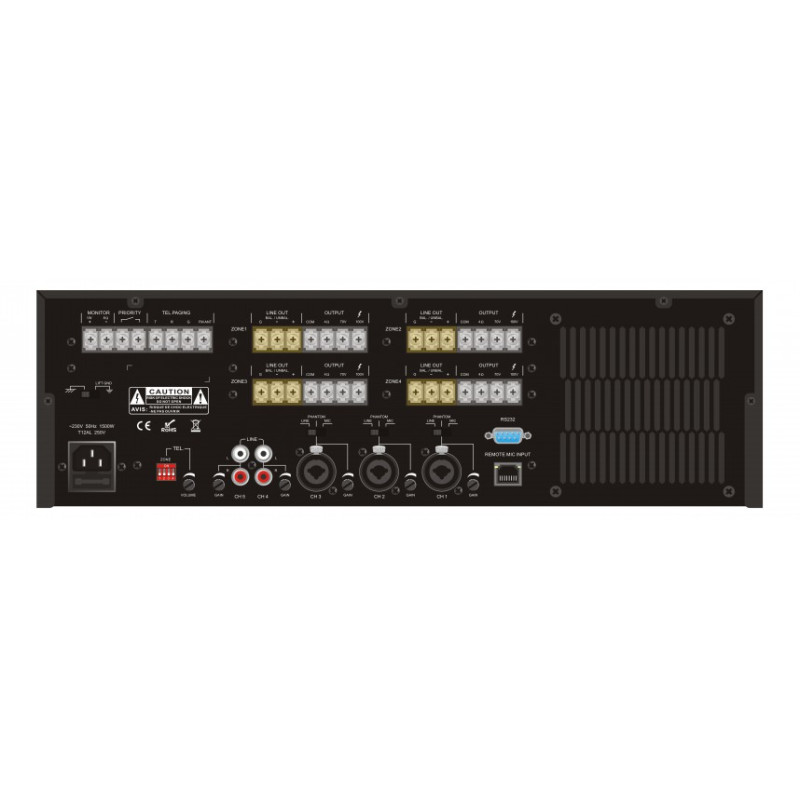 Для прослушивания каналов имеется возможность подключения отдельного мониторного динамика на 8Ом. Каждая зона усилителя может задействовать одну из предложенных для подключения линий динамиков на 70В, 100В или 4Ом.