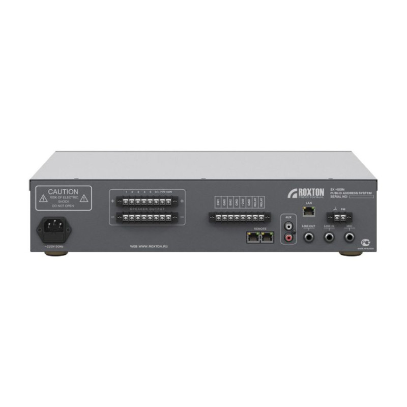 Блок дистанционного управления модулем речевого сообщения, активации линейного входа и сигналов события, обеспечивает ROXTON SX-480N сопряжение с системами ОПС, ГО и ЧС. Помимо этого, для дистанционного управления оповещением к моноблоку подключается до 4-х микрофонных консолей ROXTON SX-R31 с несколькими уровнями приоритетов.