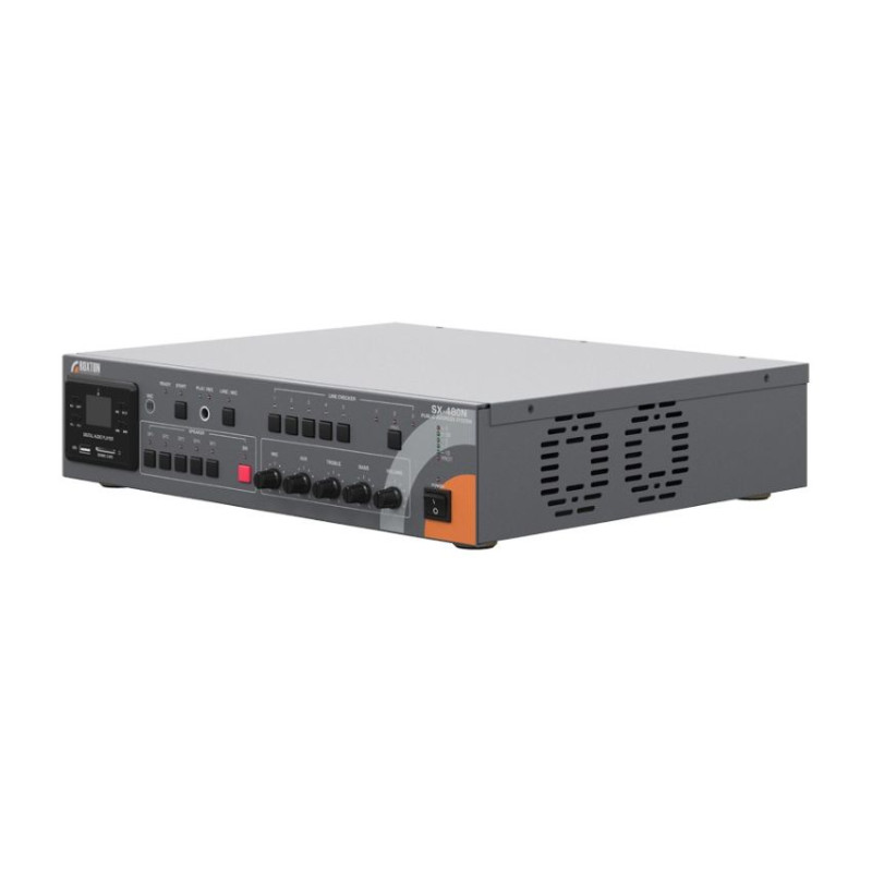 Система включает в себя блок автоматического контроля до 5-ти линий громкоговорителей, трансляционный усилитель мощностью 480 Вт с 2-мя линейными и 1-м микрофонным аудиовходами, темброблоком, поканальными регуляторами громкости регуляторами и селектором зон. Помимо этого, в систему встроен аудио проигрыватель с поддержкой внешних USB/SD накопителей и FM тюнер, что делает ненужным использование внешних источников аудиосигнала.