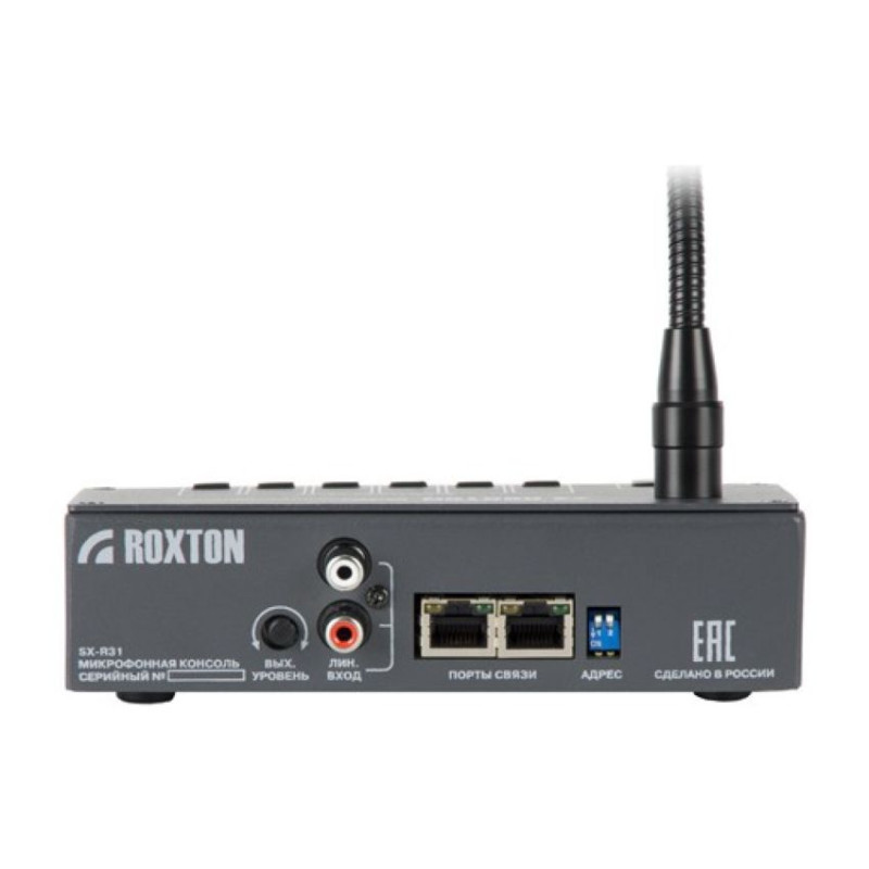Микрофонная консоль - это устройство, совмещающее в себе функции селектора зон, микшера и микрофона. Консоль ROXTON SX-R31 предназначена для выбора нужных зон (до 5 зон) и передачу в них речевого сообщения с микрофона или музыкального источника, подключенного к разъему на задней панели.