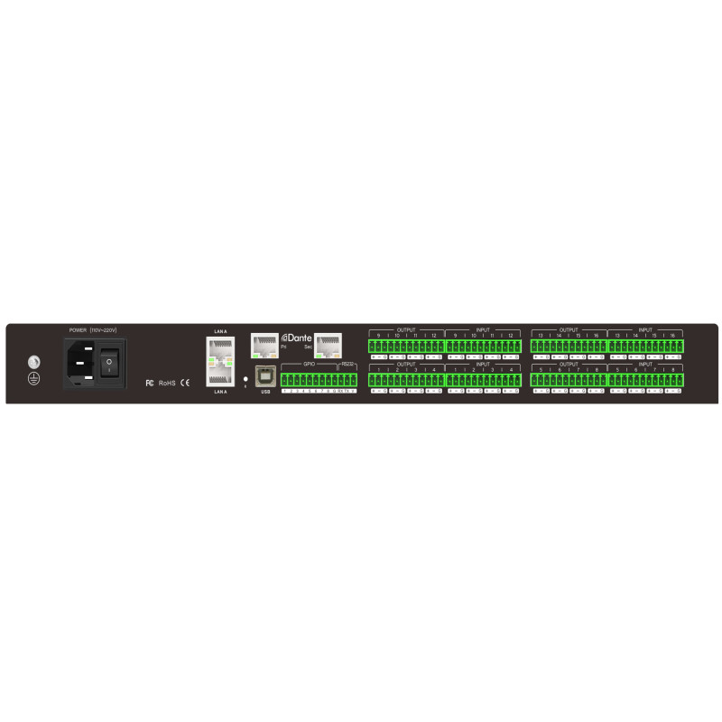 Цифровой аудиопроцессор представляет собой устройство для свободно настраиваемой обработки и управления звуком. На передней панели процессора имеется цветной дисплей высокой четкости, на котором отображается текущее рабочее состояние устройства. В процессоре используются передовые технологии цифровой обработки сигнала. Система предоставляет пользователю различные модули обработки звука на выбор и имеет открытую программную архитектуру, что позволяет решать разнообразные практические задачи в разных приложениях. 128 Dante аудиоканалы обеспечивают высокую пропускную способность, малую задержку и высокую совместимость, что позволяет пользоваться недорогим решением для передачи аудиосигнала по сети.