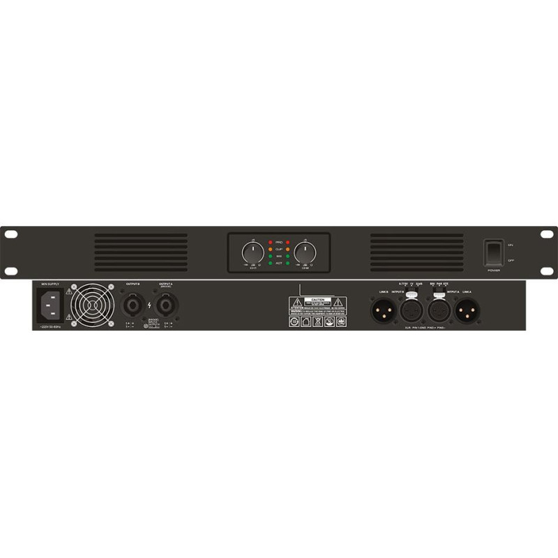 2 основных входа и 2 сквозных выхода сделаны на стандартных разъемах XLR. Основные выходы используют коннекторы SpeakON. Функционал устройства обеспечивает качественную и стабильную работу, используя автоматический лимитер, систему охлаждения, а также защиту от перегрева, перегрузки и короткого замыкания. Питание усилителя осуществляется от сети.