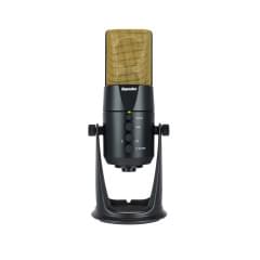 Поддерживается частота дискретизации 96 кГц и разрядность 24 бита. Благодаря технологии plug-and-play и эргономичному дизайну модель отлично подойдет для подкастинга, игр/онлайн-трансляций и записи музыки. Микрофон с двойной мембраной размером 25 мм захватывает все нюанса голоса или инструмента. Можно выбрать из трех диаграмм направленности: восьмерка, круг, кардиоида. На передней части корпуса расположены регуляторы чувствительности, вход и инструментальный выход под наушники. Последний, как и инструментальный, расположен на задней части корпуса. В инструментальный вход можно также подключить внешний микшер. Прилагается настольная подставка и адаптер на микрофонную стойку.