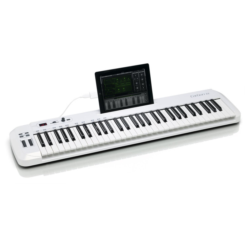 Главное преимущество Carbon 61 перед остальными контроллерами - возможность подключения к вашему iPad и работа с многочисленными приложениями, поддерживающими MIDI-контроллеры. Специальная встроенная подставка позволяет размещать iPad на корпусе клавиатуры, можно даже запитать контроллер прямо от планшета и работать совершенно при любых условиях.