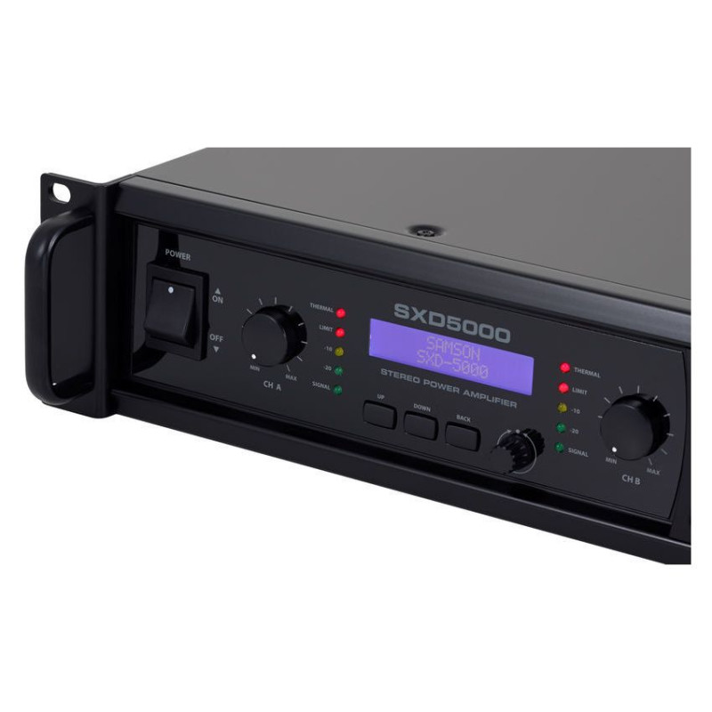 Встроенный цифровой процессор DSP усилителя Samson контролируется с помощью ЖК-дисплея с подсветкой, предназначенного для использования в условиях низкой освещенности, в том числе затемненых сцен. Усилитель мощности имеет фильтры высоких и низких частот, 3-полосный эквалайзер, выходной лимитер и установку времени задержки для выравнивания громкоговорителей. Для быстрой настройки, SXD5000 имеет четыре предустановки, которые призваны обеспечить оптимальные настройки для различных стандартных конфигураций акустических систем. Кроме того, усилитель мощности предлагает установку защитного пароля для защиты установленных параметров.