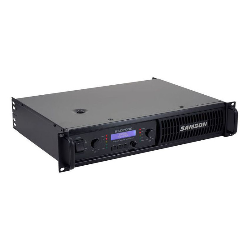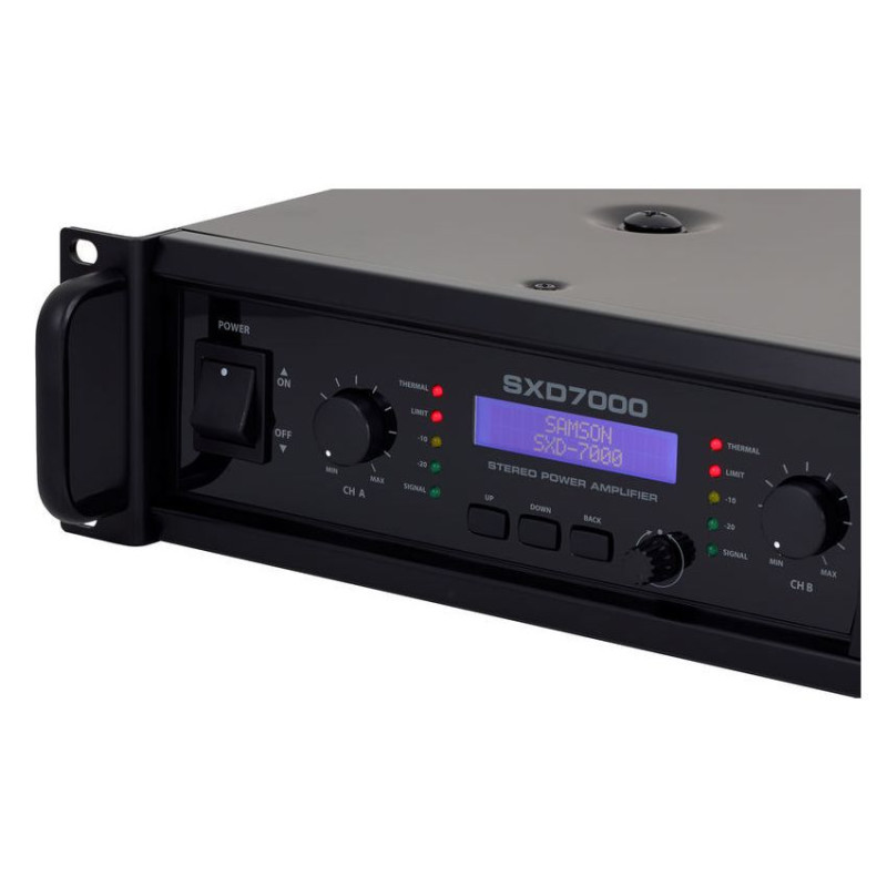 Встроенный цифровой процессор DSP усилителя SXD7000 контролируется с помощью ЖК-дисплея с подсветкой, предназначенного для использования в условиях низкой освещенности, в том числе затемненых сцен. Усилитель мощности имеет фильтры высоких и низких частот, 3-полосный эквалайзер, выходной лимитер и установку времени задержки для выравнивания громкоговорителей. Для быстрой настройки, Samson SXD7000 имеет четыре предустановки, которые призваны обеспечить оптимальные настройки для различных стандартных конфигураций акустических систем. Кроме того, усилитель мощности предлагает установку защитного пароля для защиты установленных параметров.