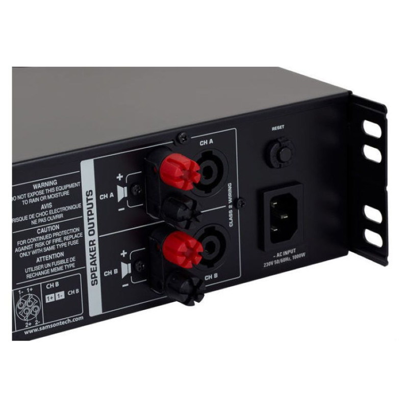 Усилитель Samson имеет удобный дизайн для монтажа в стойки 19" и номинальную мощность каждого канала 1000 Вт при нагрузке 4 Ома. Усилитель тщательно разработан, чтобы обеспечить надежное и чистое звучание с низким уровнем искажений и широким динамическим диапазоном с полным диапазоном частотного спектра 20 Гц-20 кГц.